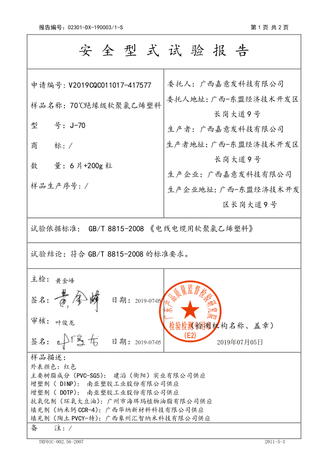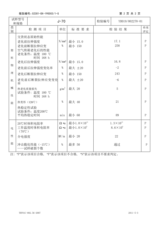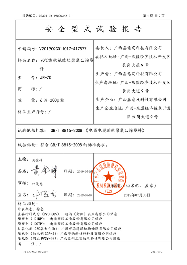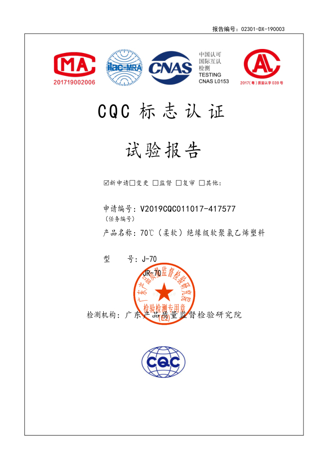 70 °C(柔软)绝缘级软聚氯乙烯塑料试验报告